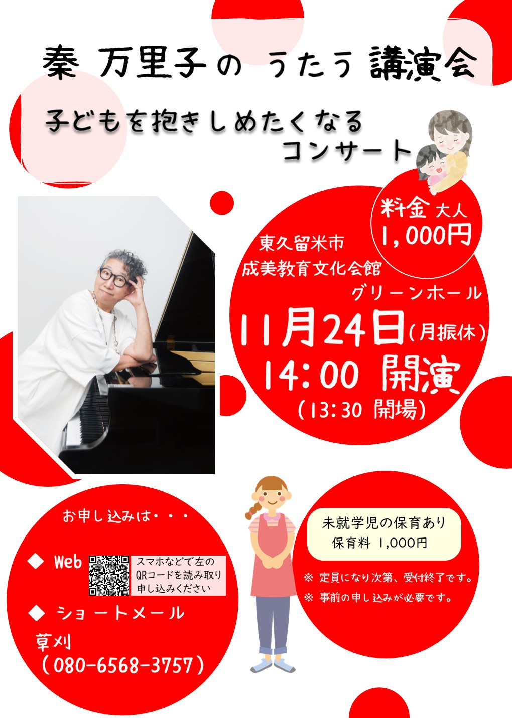【お申込み受付中】11/24(月・祝)秦万里子のうたう講演会 子どもを抱きしめたくなるコンサート@東久留米市